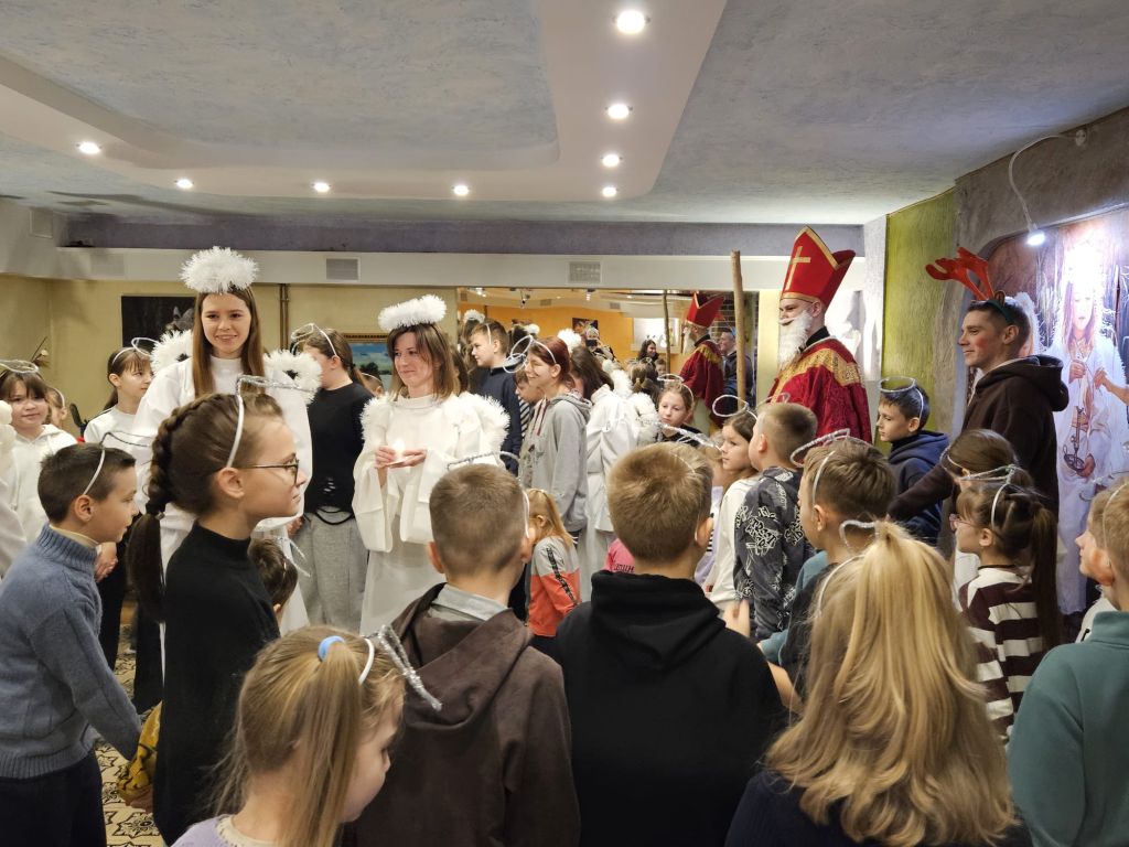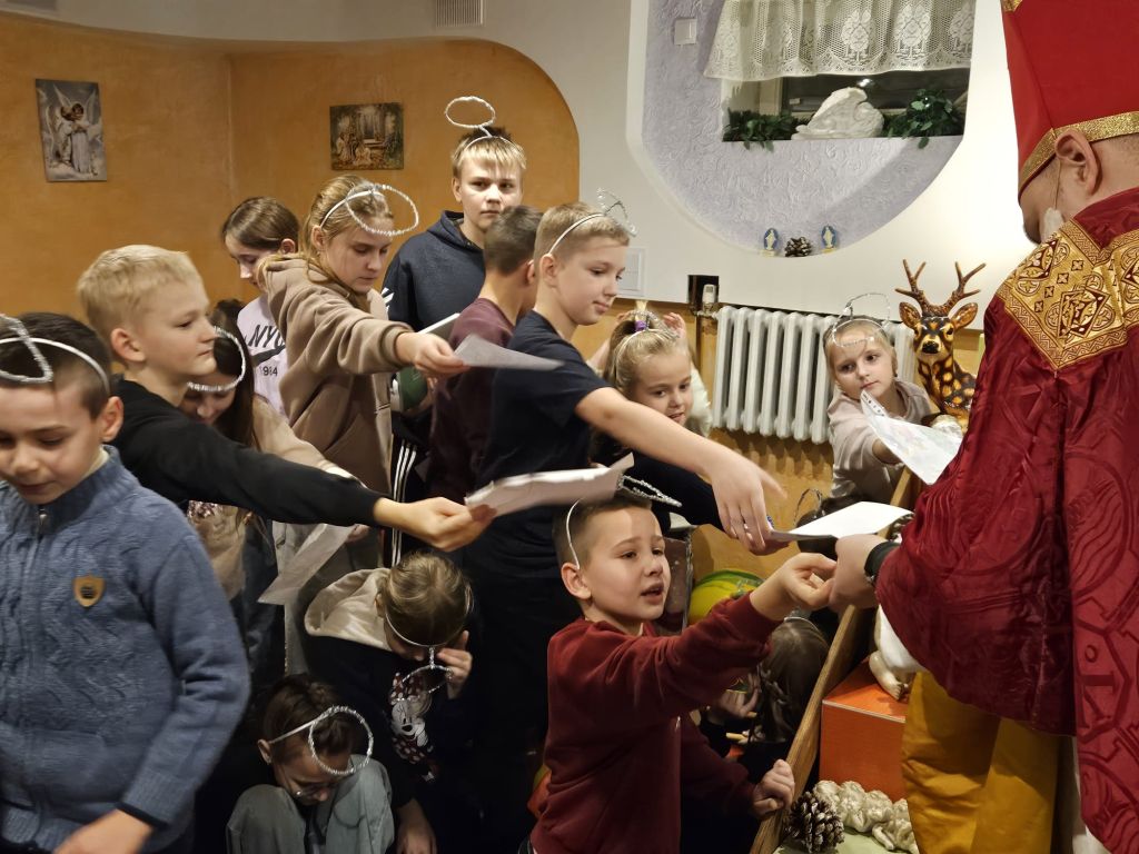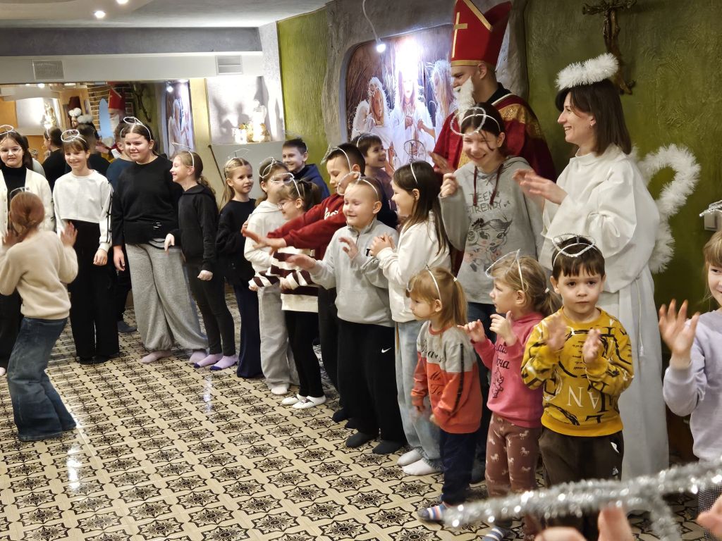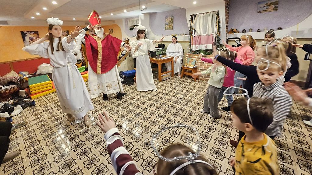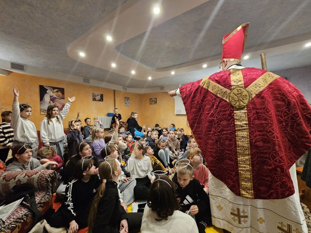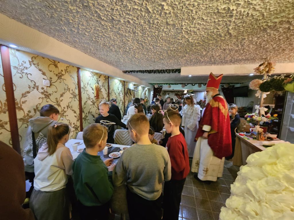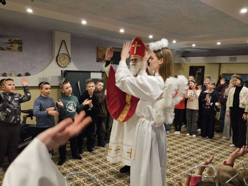 São Nicolau na sala infantil em Szydłowicze, Bielorrússia, em 6 de dezembro de 2025