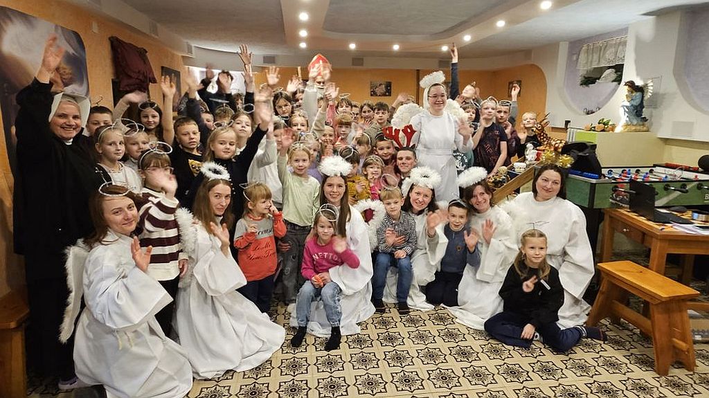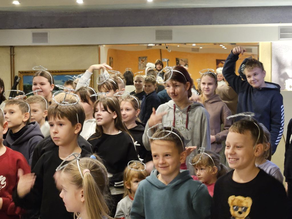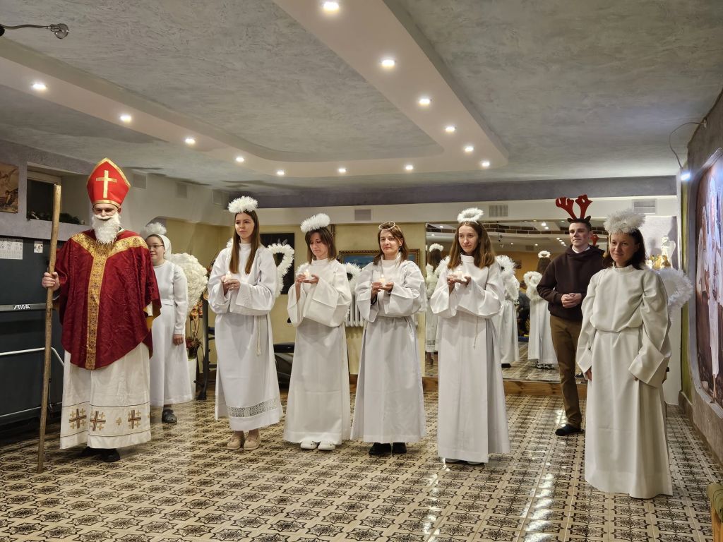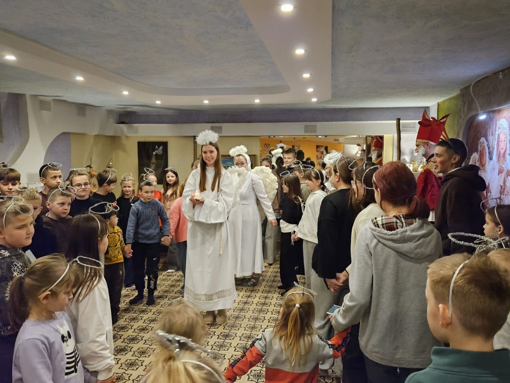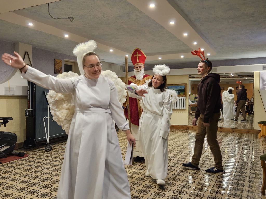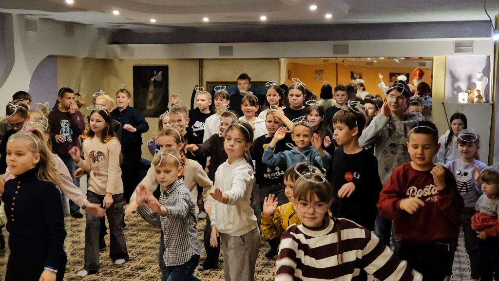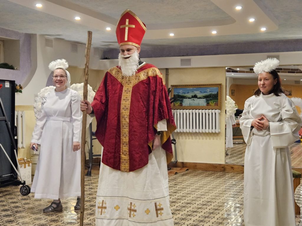 São Nicolau na sala infantil em Szydłowicze, Bielorrússia, em 6 de dezembro de 2025