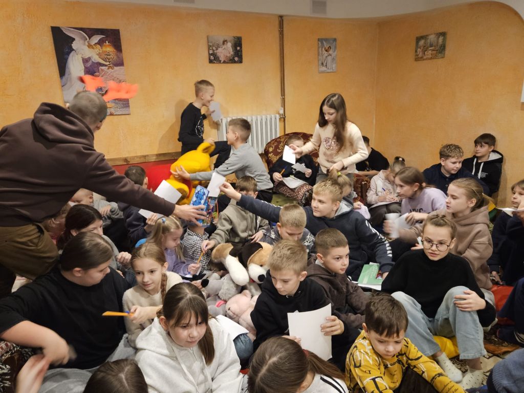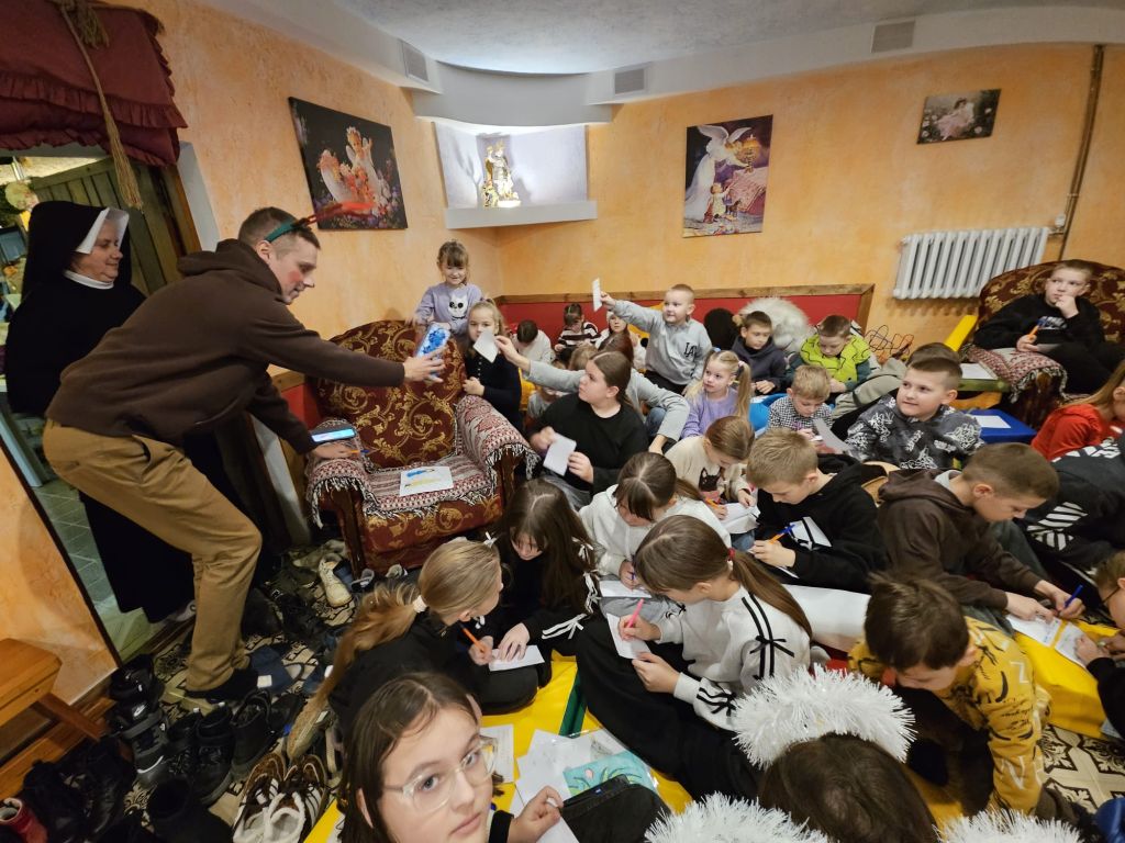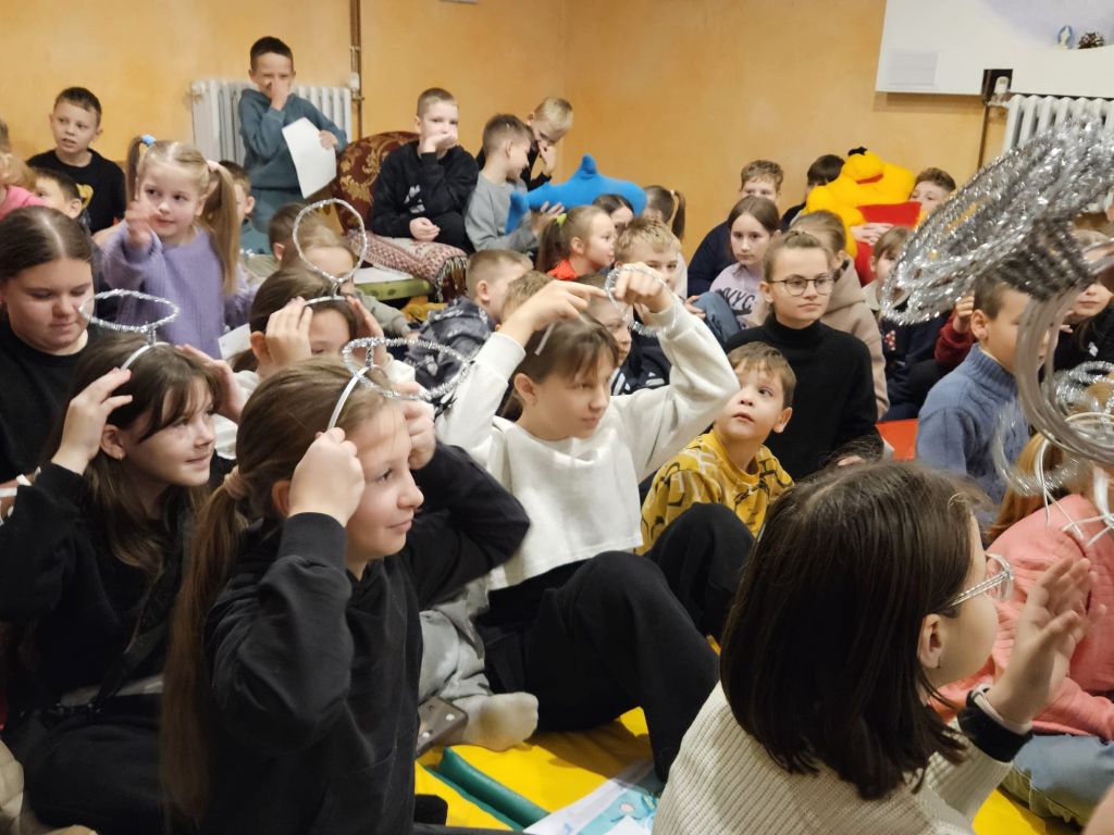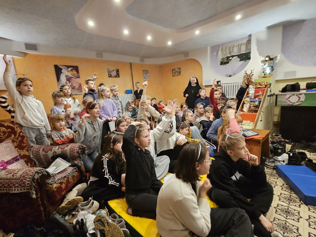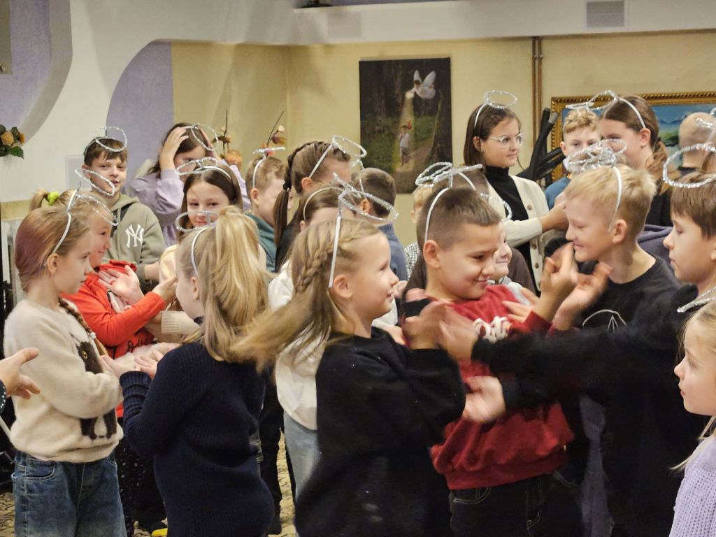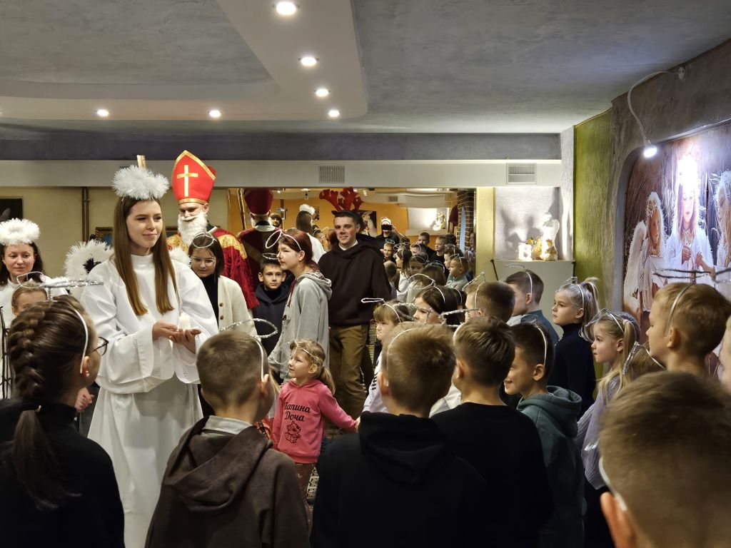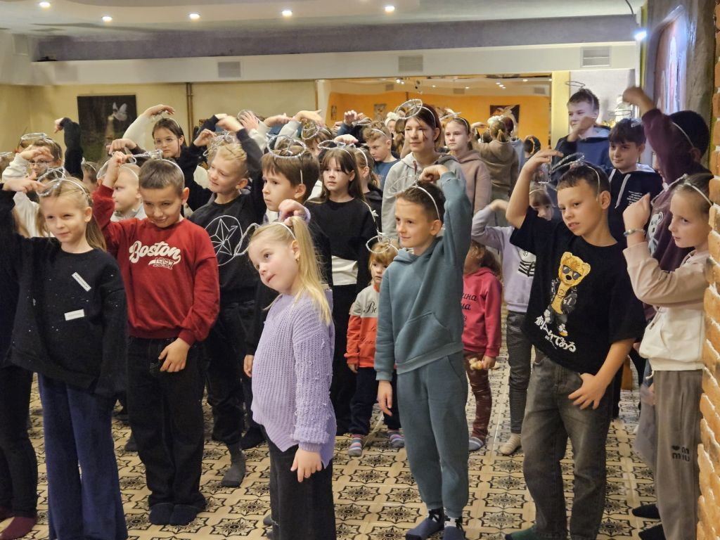 São Nicolau na sala infantil em Szydłowicze, Bielorrússia, em 6 de dezembro de 2025