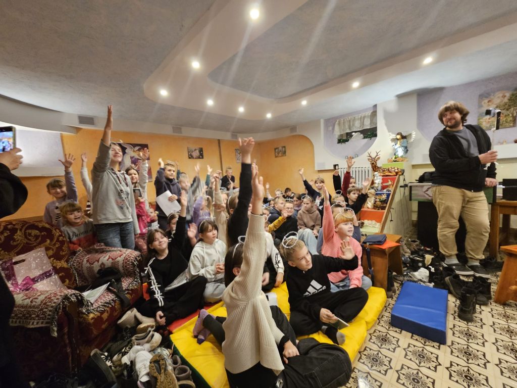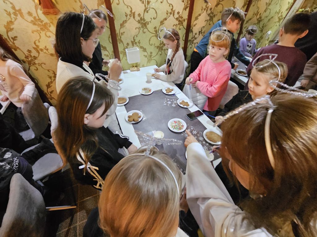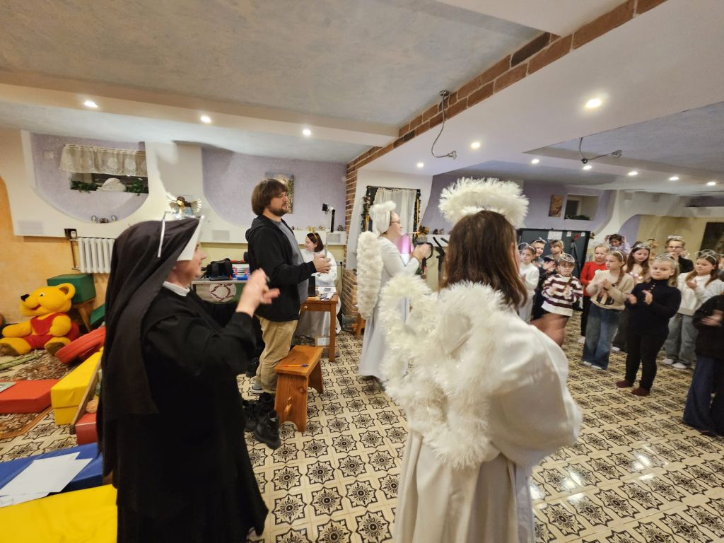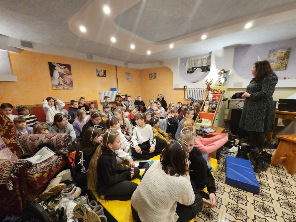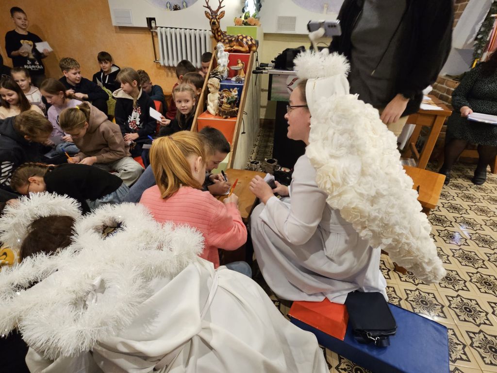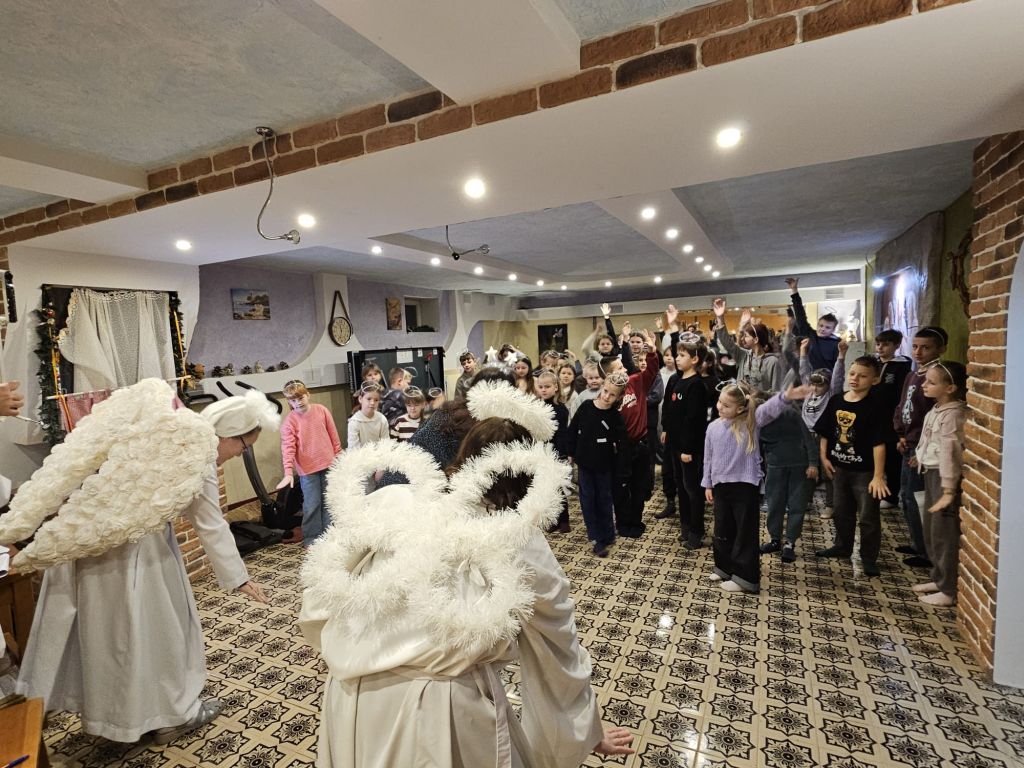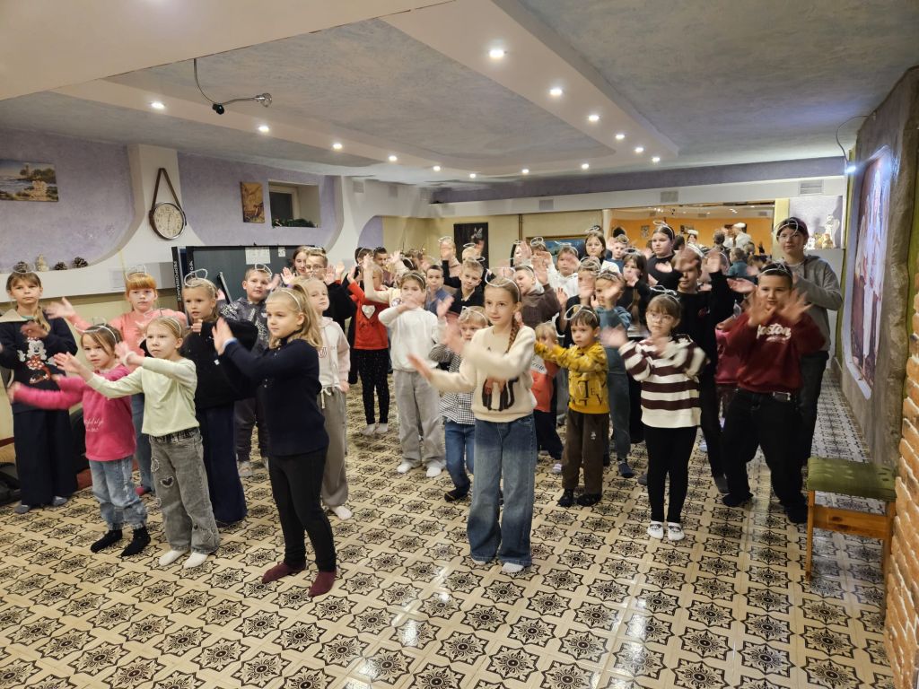 São Nicolau na sala infantil em Szydłowicze, Bielorrússia, em 6 de dezembro de 2025